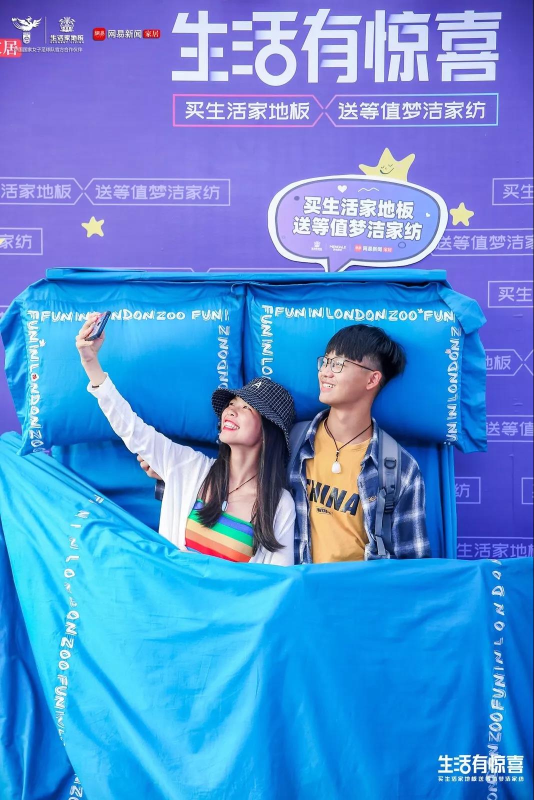 此外,在活動現(xiàn)場的另一側(cè),以生活家地板和夢潔家紡為主題的拍照打卡網(wǎng)紅裝置也大受歡迎,站立著拍一張?zhí)稍诖采系恼掌宫F(xiàn)睡覺時的囧態(tài)。原來,今年上半年,生活家和夢潔家紡這兩大家居圈內(nèi)的老友官宣達成年度戰(zhàn)略合作伙伴,在今年超級新品日期間,生活家發(fā)起買多少地板送多少夢潔家紡的優(yōu)惠活動,讓消費者享受下半年家裝優(yōu)惠。
